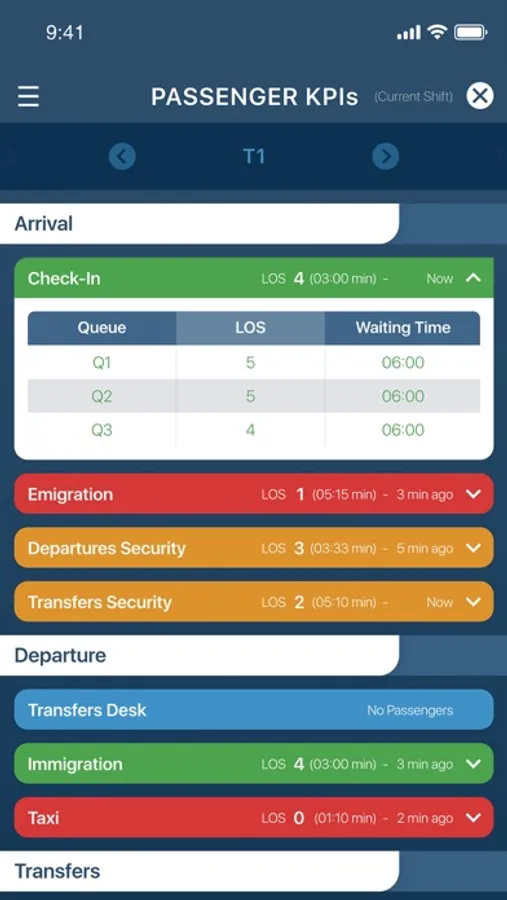 Monitor terminal operations by examining the number of waiting passengers in each area, number of open desks and the waiting time for each queue directly from the passenger crowd management system. Get to know how passengers are moving within each area using "Live View".