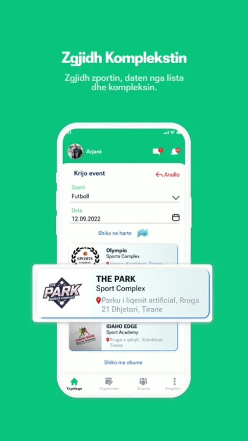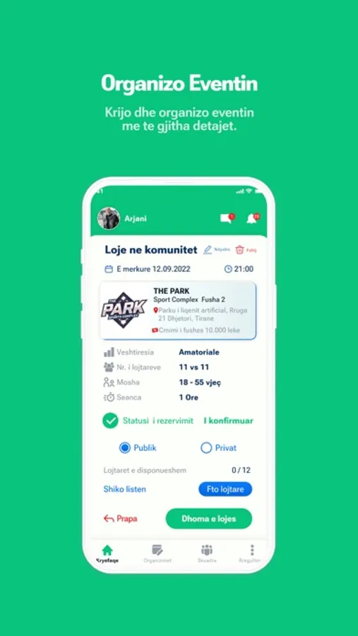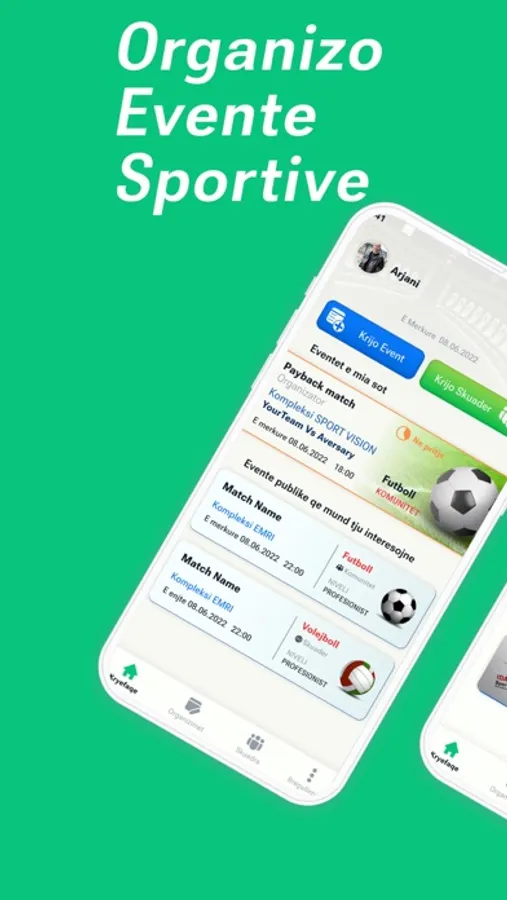 Sportisti ju ndihmon qe te rezervoni hapesiren tuaj ne komplekse dhe fusha te ndryshme sportive. Organizoni evente, krijoni skuadra, ftoni miq apo kerkoni lojtare qe te bashkohen ne evente publike ose behu pjese e tyre.