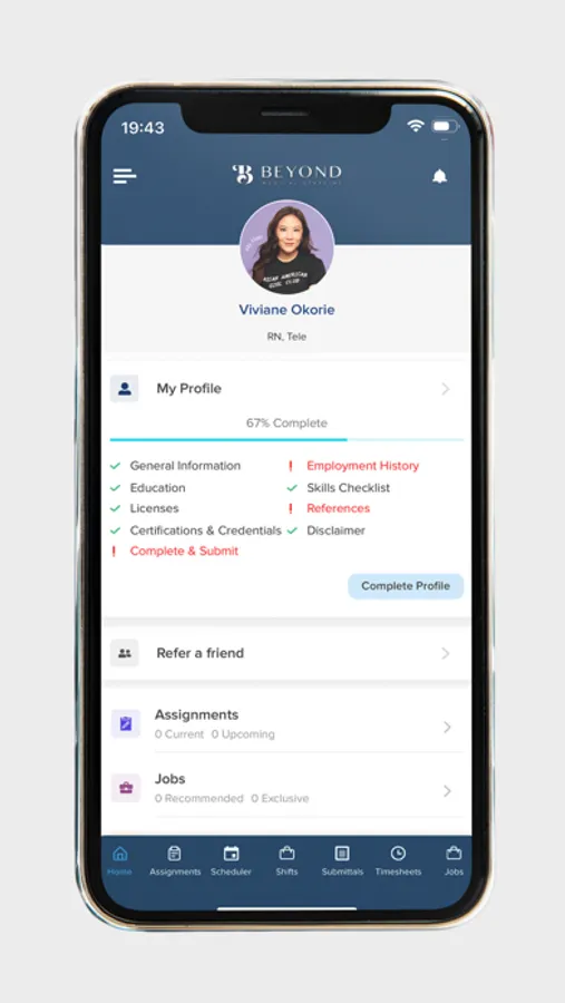 BeyondStaff app is easy to set up. Once you have the app downloaded, open it and fill out all the required fields, then submit. Easily message your recruiter right from the app for pertaining questions. We receive your application and credentials for verification. Once you’ve been verified, you can apply and start receiving job offers. You’re all set!