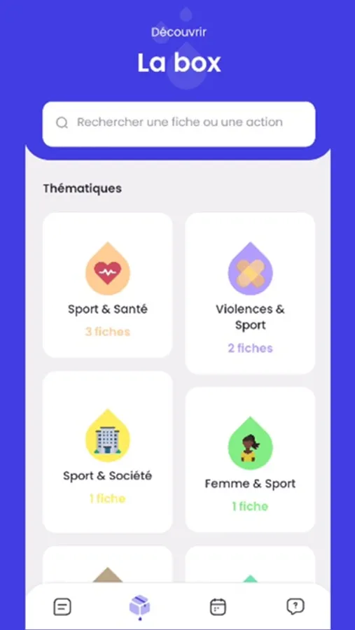 Elle contient un outil appelé "La Box" : un ensemble de fiches et d'actions autour de 8 thématiques : Sport & Performance, Sport & Développement, Métiers du Sport, Femme & Sport, Sport & Olympisme, Sport & Société, Violences & Sport et Sport & Santé.