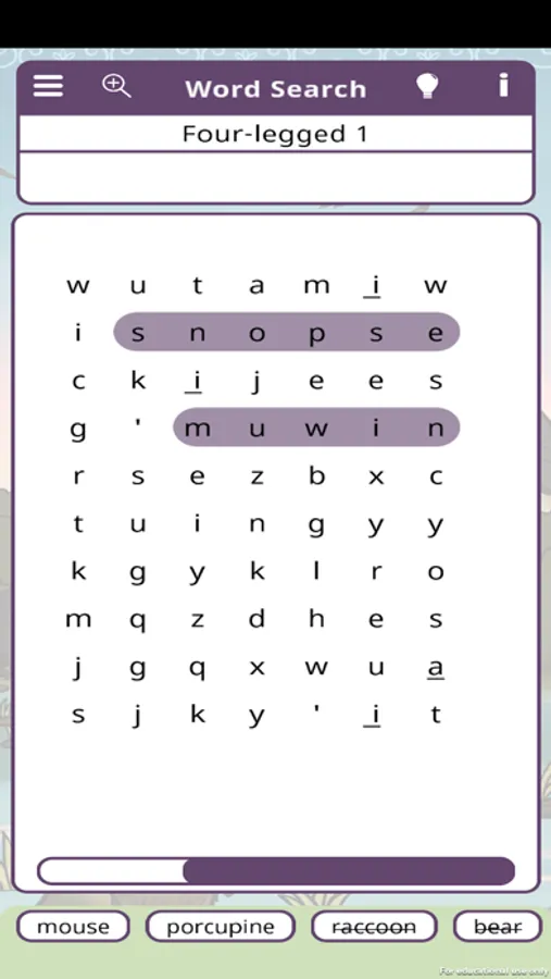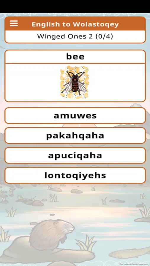 Build your Wolastoqey vocabulary with the Welamukotuk Vocab Builder game for your iOS phone or tablet. Quiz yourself every day to learn different categories – animals, food, drinks, and more! The app includes: