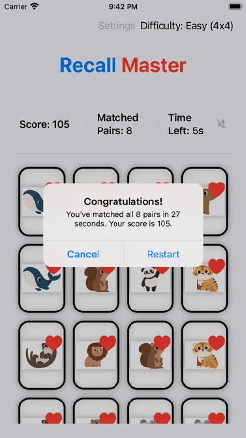 Master MemMatch is an entertaining and captivating matching game to evaluate your recall abilities. Select from various difficulty levels and themes, including Animals and Objects. Immerse yourself in the game with audio and haptic feedback. Watch your score and time as you play on smartphones and tablets. Get Master MemMatch now and put your recall skills to the test!