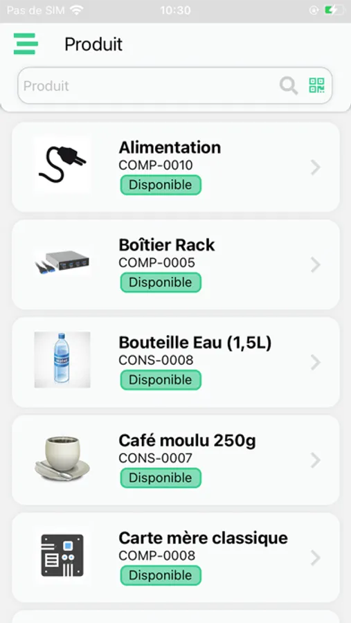 - Product: product visualization with stock indicators and characteristics
