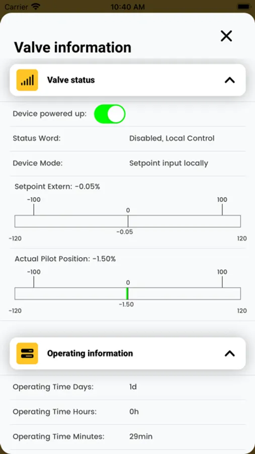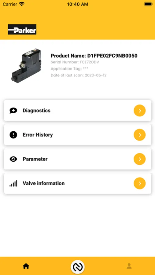The Parker Device Connect app provides a quick overview about the current status of Parker devices equipped with an NFC interface. The diagnosis of the devices is possible when it is switched-on and without power supply.