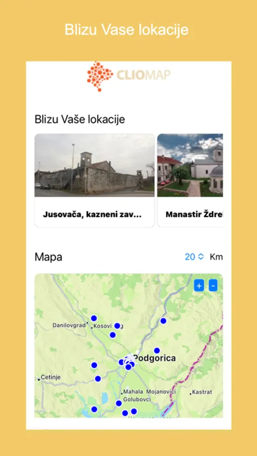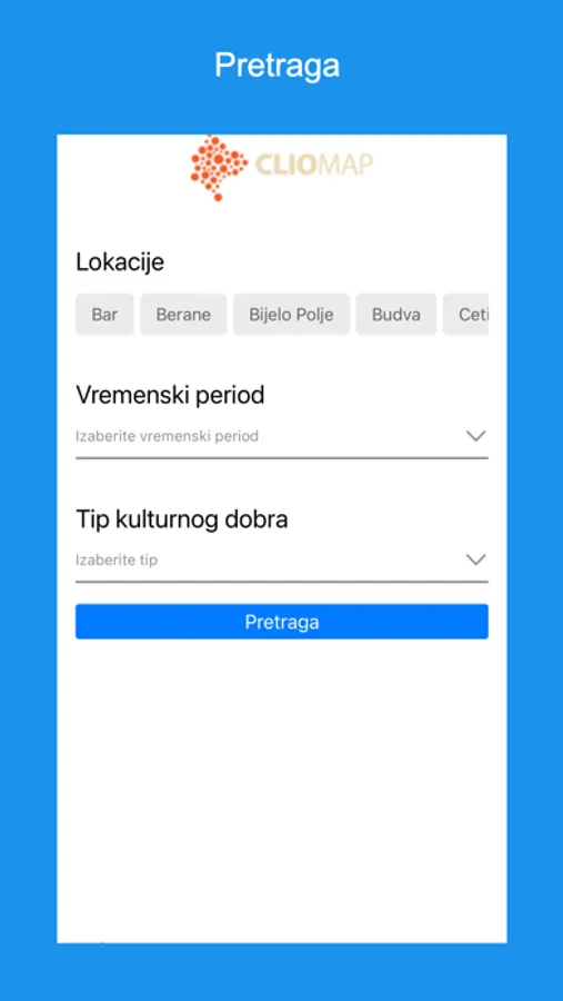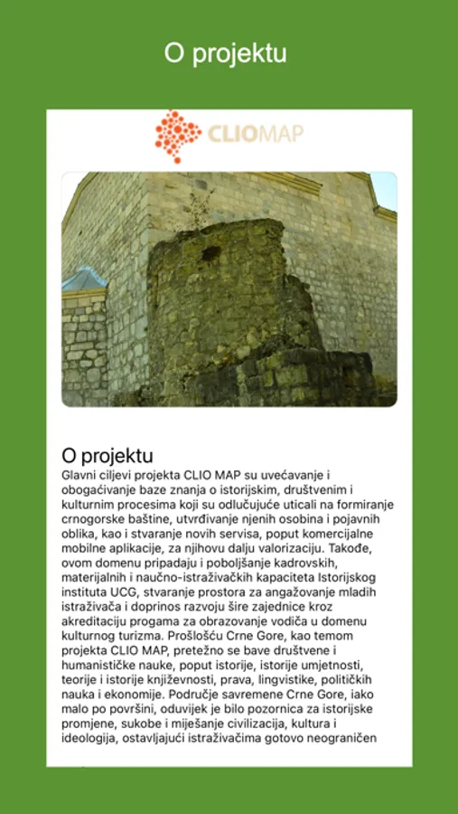 Glavni ciljevi projekta CLIO MAP su uvećavanje i obogaćivanje baze znanja o istorijskim, društvenim i kulturnim procesima koji su odlučujuće uticali na formiranje crnogorske baštine, utvrđivanje njenih osobina i pojavnih oblika, kao i stvaranje novih servisa, poput komercijalne mobilne aplikacije, za njihovu dalju valorizaciju.