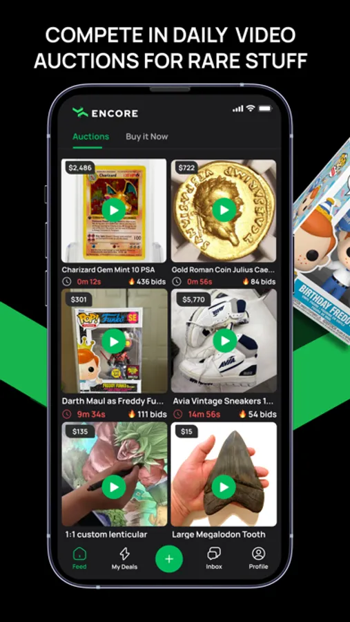 Encore is a social marketplace where you shop by watching videos of your favorite sellers pitching your favorite authentic products, like rare Funko Pops, Sports Cards, Autographed Memorabilia, Comics, Lego, Pokémon, Streetwear, Sneakers, Vintage Clothing, Antiques, and even 3D Printed Items!