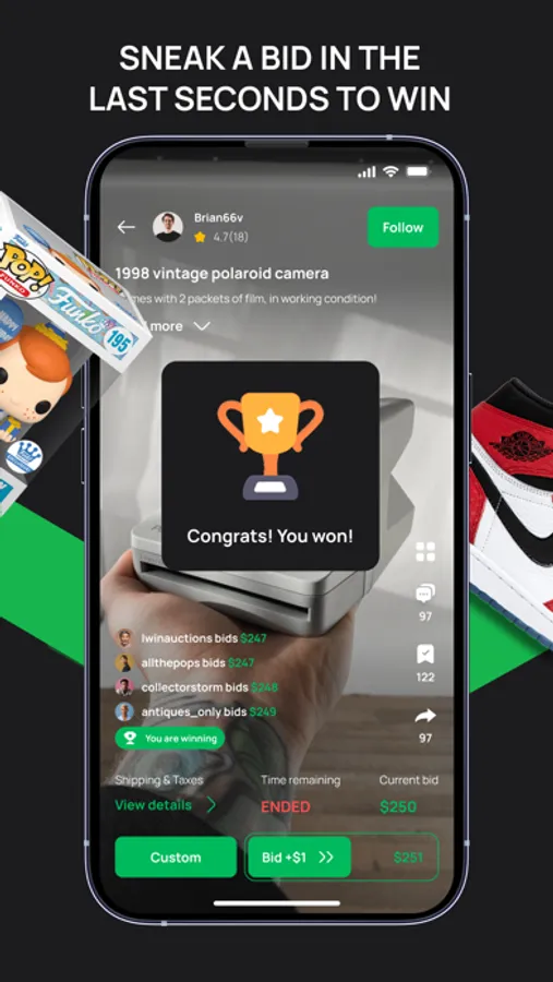 Sellers make entertaining videos of their products that you watch while shopping on Encore. You can purchase items directly from videos, comment on videos, save videos, and follow your favorite sellers to make your shopping experience personalized, a way of shopping like no other marketplace. Browse by latest listings or by category. Videos are searchable, so if you know generally what you're looking for, just search for the item and watch your favorite sellers pitch you that rare item you're hunting, whether it’s a signed Funko Pop, Trading Card, or Sports Memorabilia item.