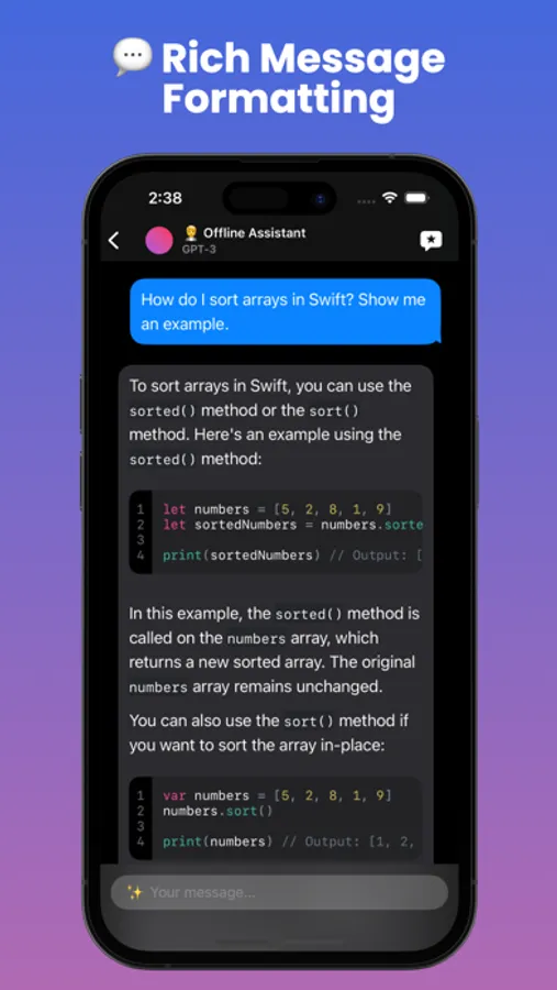 Engage in dynamic interactions with rich messages, full markdown support, and syntax highlighting for coders.