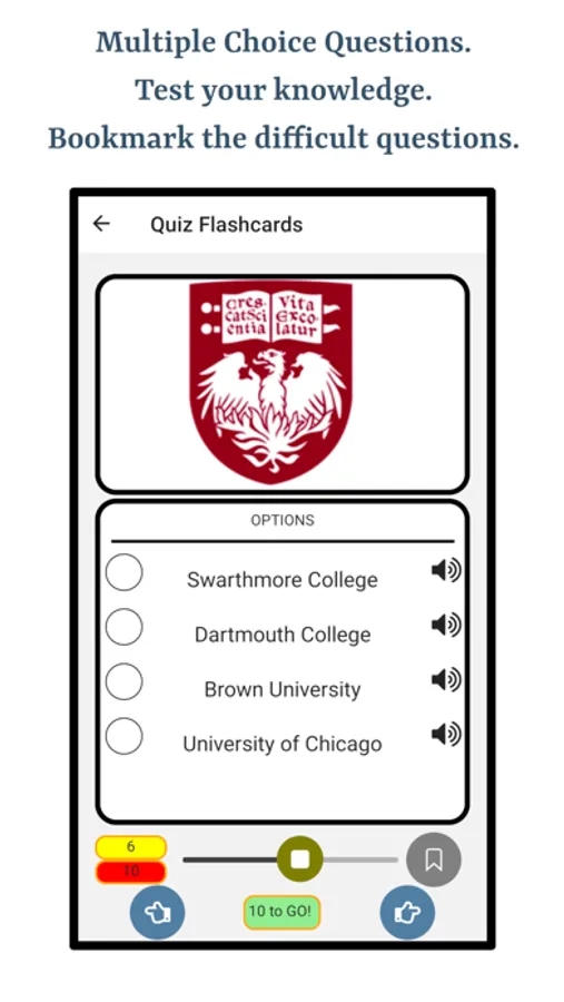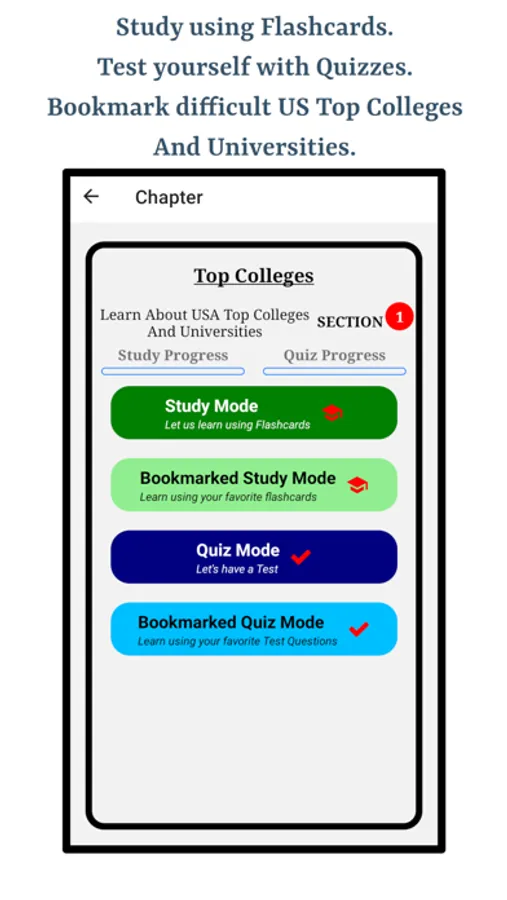 This app is a great resource to memorize USA Top Colleges And Universities. The app is engineered to make users perfect identifying famous USA Colleges And Universities by studying for a very short amount of time. Audio functionality and bookmarking is available throughout the app on chapter, section, study mode and quiz modes.
