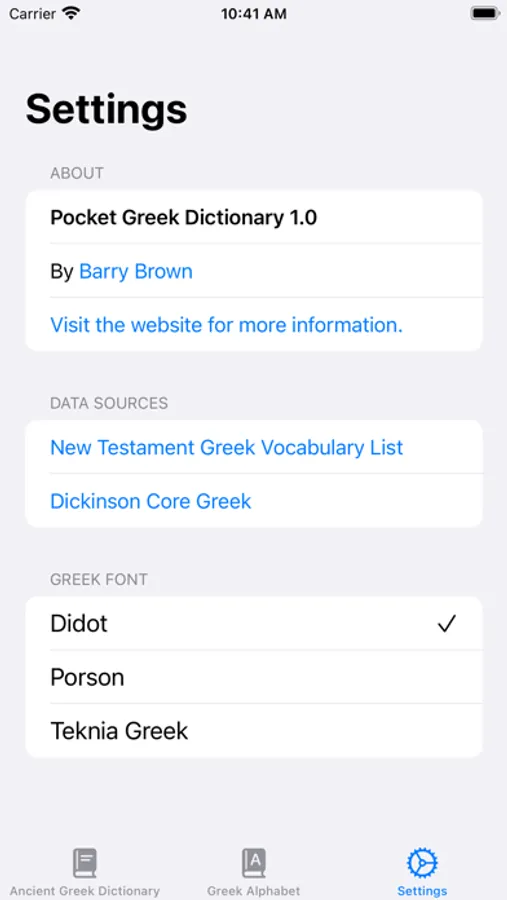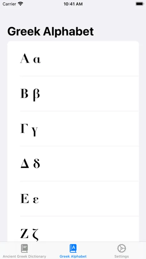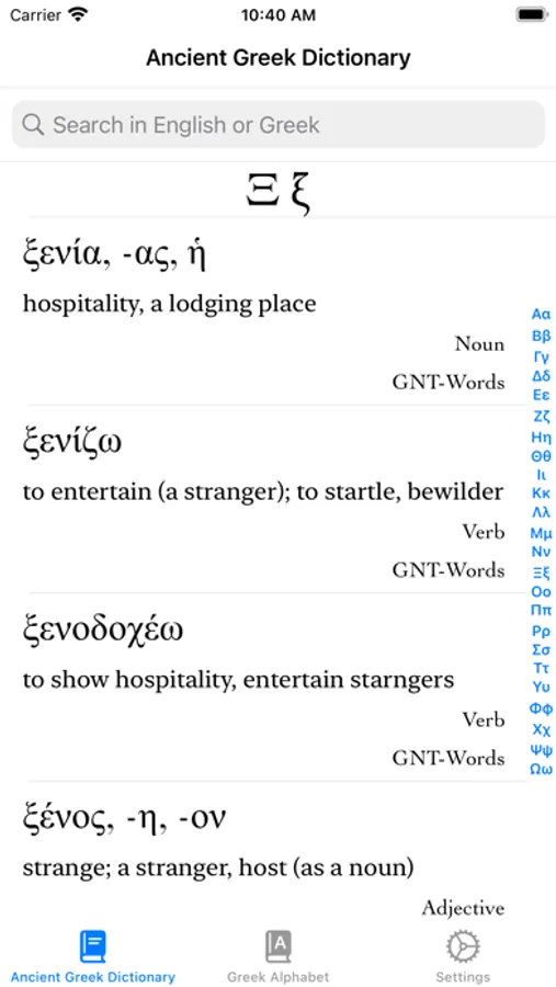Quickly look up Ancient Greek words with the Pocket Greek Dictionary! The dictionary includes over 5,000 words of Ancient Greek. You can search for words in English or in Greek. Searching in Greek ignores the diacritics which makes it quick and easy to find the word you are looking for. The Greek text font is customizable from the Settings screen inside the app. A Greek Alphabet screen displays the Greek letters for quick review and the app will speak the name of the Greek letters when you tap on them. A Word of the Day Widget is also available, allowing you to add a Word of the Day to the Home screen or Lock screen. The default update frequency of the Word of the Day widget is once per day, but it can be customized to update more frequently.