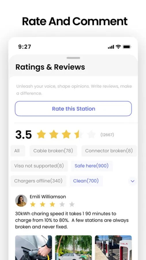 Rate Charging Stations: Users can rate and review charging stations based on their experiences, helping the community make informed decisions. Users can also upload photos of the charging stations for a more comprehensive review.