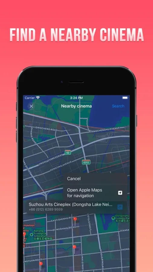 3: Find a nearby movie theater, plan your time, and click to jump to the Apple Maps app for quick navigation.