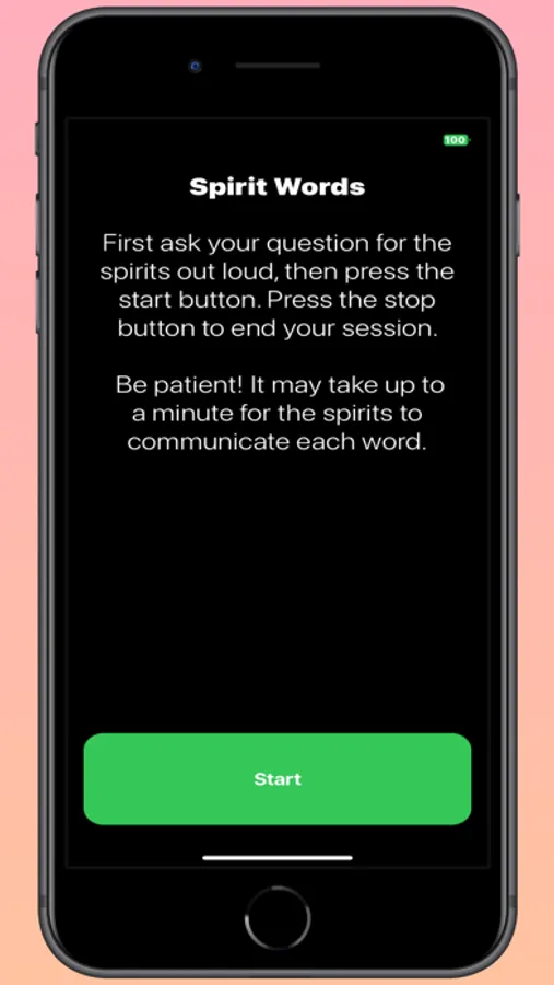 Are ghosts and spirits able to communicate with us using technology? There are many stories or people receiving messages from the other side through phone and computer technology. This app uses a database of random words that we believe spirits are able to use to communicate with us. Once you open the app state your intention or ask a question of the spirit realm then press the start button. Wait for a few seconds and our app will detect when a spirit has selected a word and it will appear on the screen. Press stop to end the connection with the spirits. To scroll just swipe up on the words.