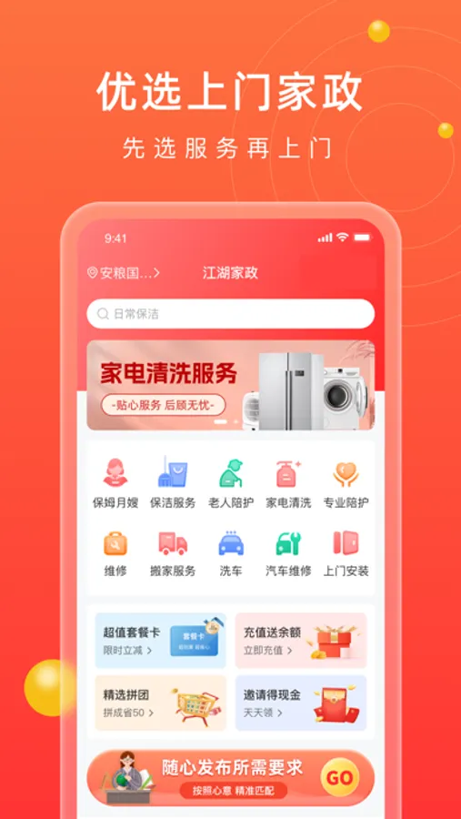 江湖家政app是江湖家政系统用户端的app端,江湖家政app涵盖了目前江湖家政的主要功能,用户可以app上选择服务项目/服务人员,然后下单,还可以直接在平台商城购买服务所需的各种周边商品。江湖家政平台主要是打造“先选服务再上门”的模式,用户可以在平台筛选服务项目或者服务人员,然后再由服务人员上门履约。入驻平台的企业和平台管理方可以在线上商家自己的产品和服务,签约合作服务人员,然后再通过平台提供的各种运营功能,提供各种服务及产品的销售,最终实现平台或企业成功经营。