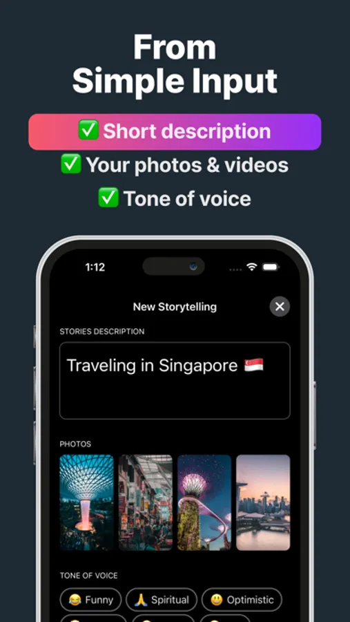 Choose the perfect images and videos from your gallery. StorytellAI will intelligently incorporate them into your Stories, creating a visually stunning narrative.
