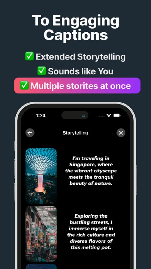 StorytellAI also empowers you to delegate the Stories creation process. Save valuable time by letting the app generate professional-looking Stories for you. Focus on enjoying your life moments while Storytell AI takes care of the creative work.