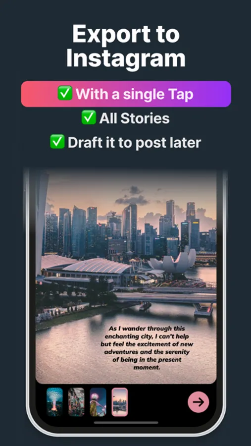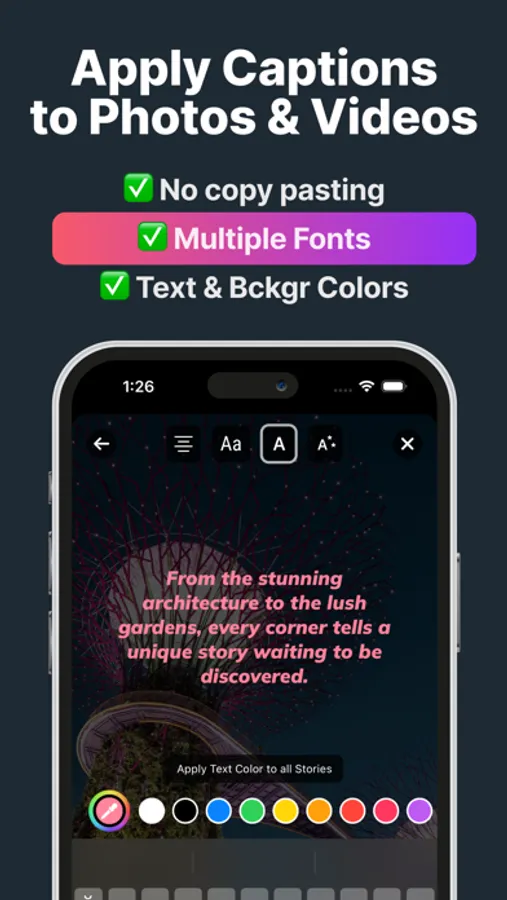 No more hassle of copy pasting from one app to another. With StorytellAI, you can conveniently edit your Stories within the app itself. Make tweaks, change Fonts and Colors. Once you're satisfied, publish your Stories directly to Instagram with a single tap.