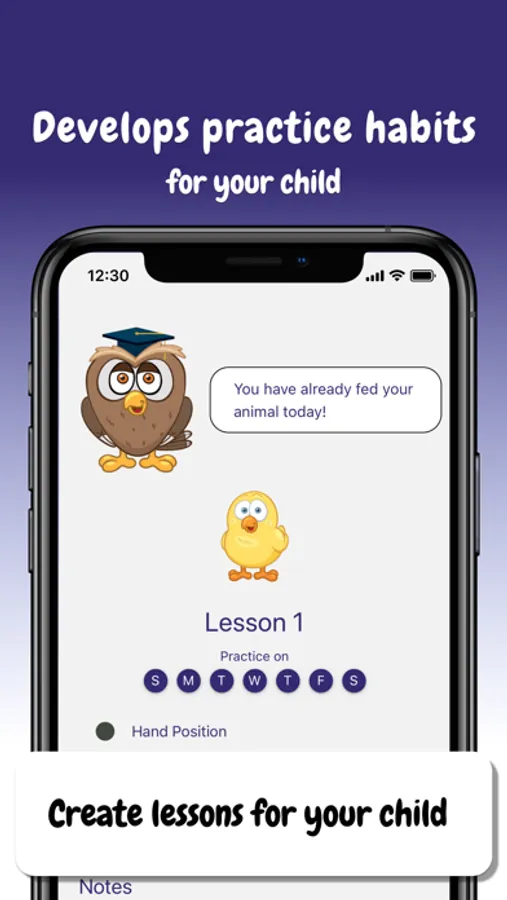 One of the key benefits of using a practice app is that it allows students, parents, and teachers to quickly and easily see how often the students have practiced. The students will see it in a fun interface catering to young children. The lessons will be represented by animals, and the animals will get sad if the student neglects to practice.