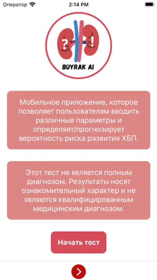 Мобильное приложение, которое позволяет пользователям вводить различные параметры и определяет/прогнозирует вероятность риска развития ХБП. В этой модели используется модель машинного обучения DecisionTree Classifier с результатом прогнозирования ССЗ с точностью 99%.
