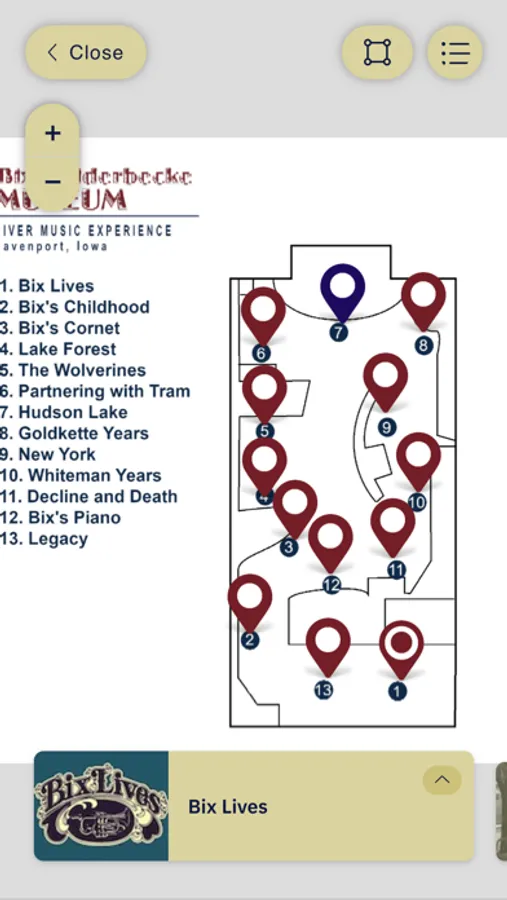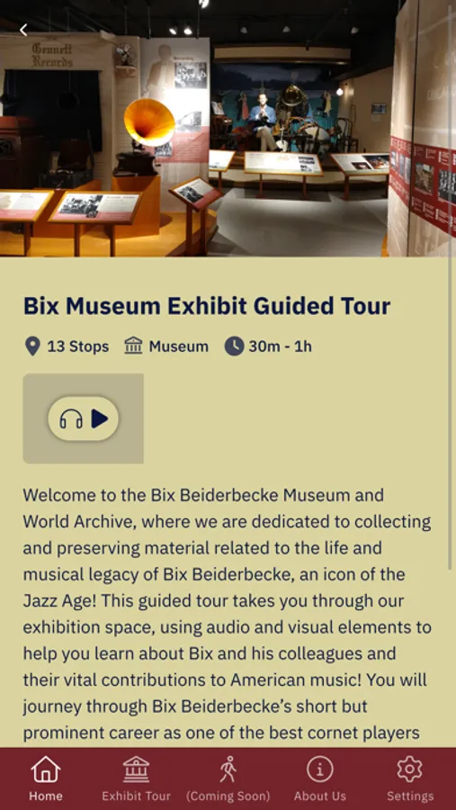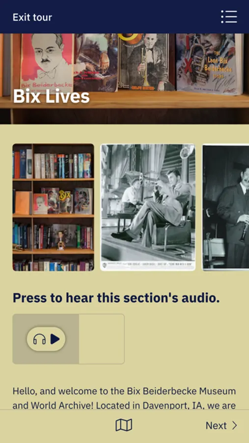 The Bix Museum is a small museum located in Bix Beiderbecke's hometown of Davenport, Iowa. Our museum is a self-guided experience that takes guests 30 minutes to an hour on average. This app provides a guided tour of our exhibit space that features both audio and visual elements to enhance your experience.