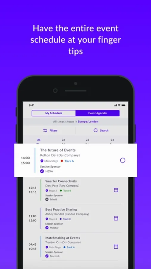 - **Personal Agenda:** build your own event agenda of the sessions you want to watch and the meetings you want to have.