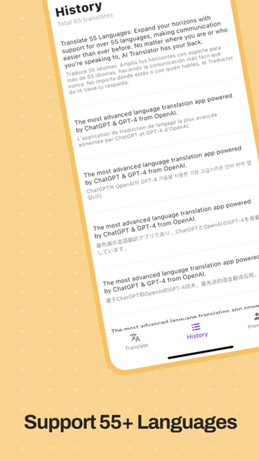 Translate 55 Languages: Expand your horizons with support for over 55 languages, making communication easier than ever before. No matter where you are or who you're speaking to, AI Translator has your back.
