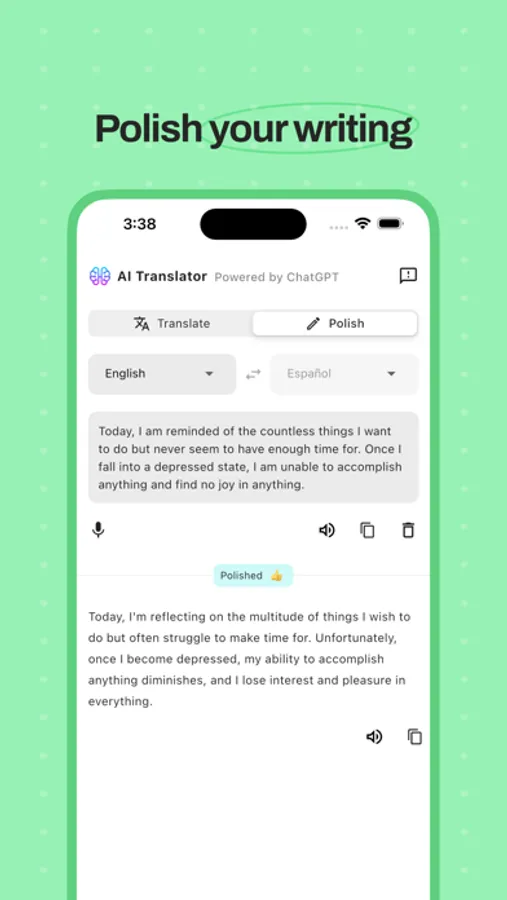 Text Polishing: Enhance your input text with our polishing mode, which refines grammar, style, and clarity to ensure your message is professional and polished.