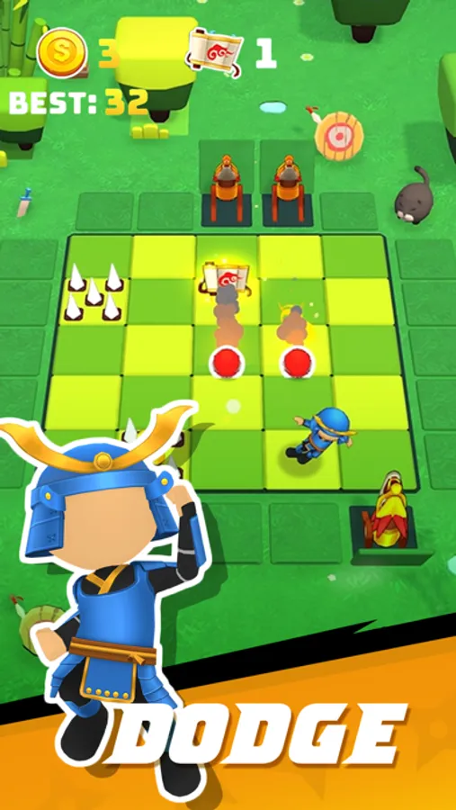 Swipe to move and fastly dodge the obstacles that appear randomly. Collect the gold and scrolls as many as you can to increase the scores. The game will finish if one of the obstacles hits you.