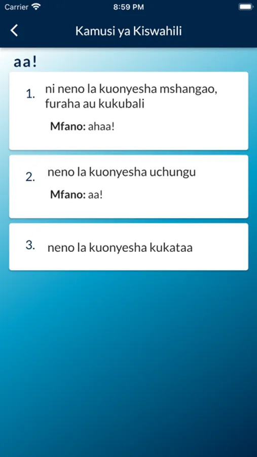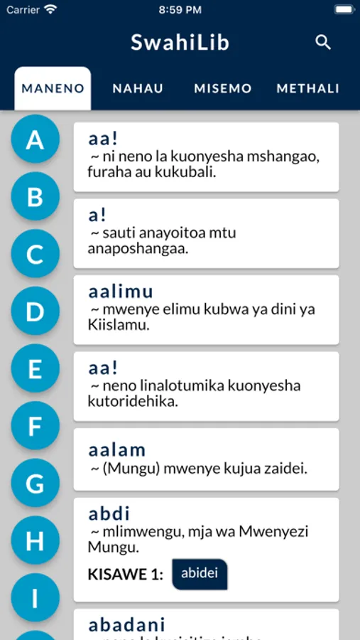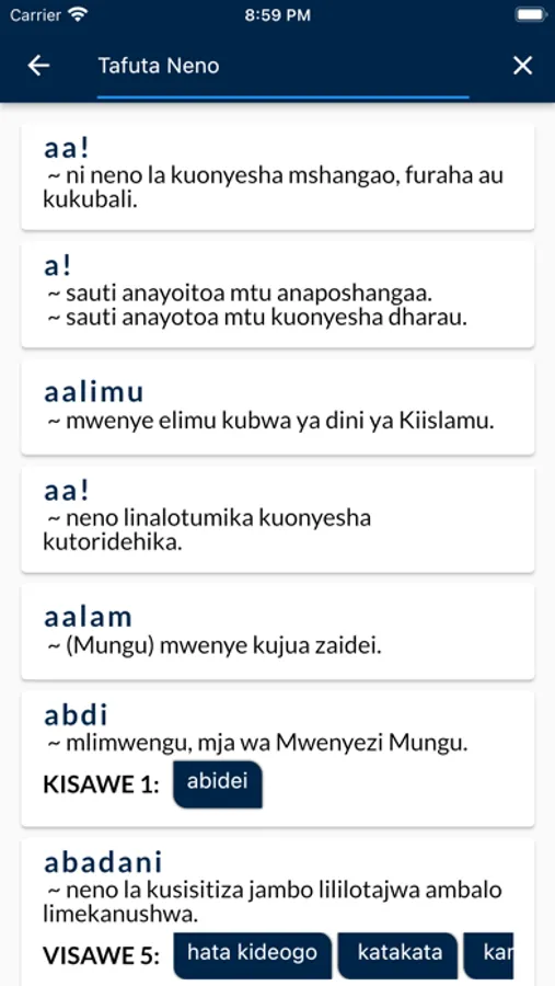 We promise you a user friendly Swahili app equipped with words (maneno), idioms (nahau), sayings(misemo) and proverbs (methali) for your Kamusi ya Kiswahili seamless experience