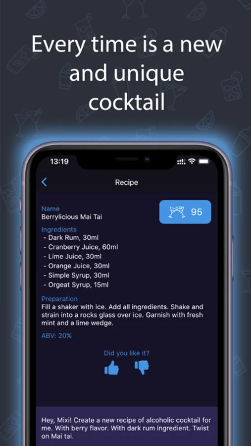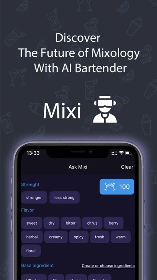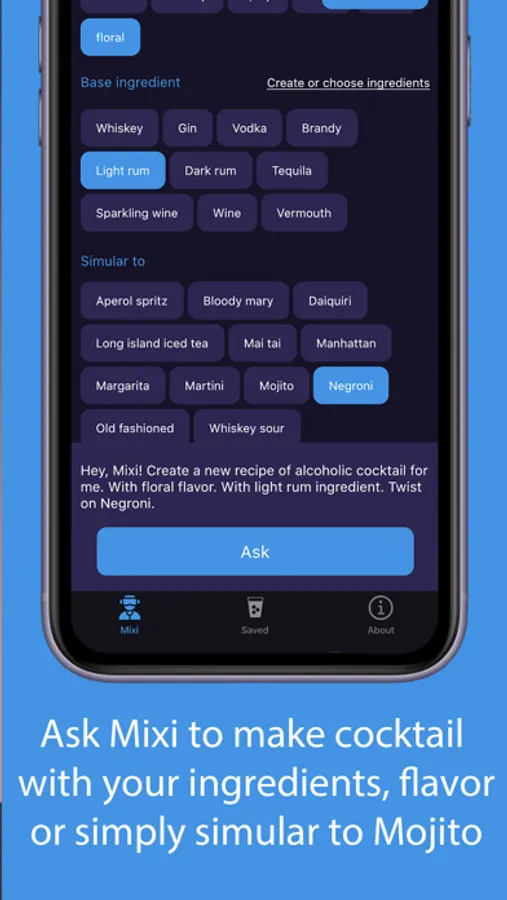 Our app revolutionizes the way we view cocktail apps. With the development of new technologies, we no longer have to sift through thousands of recipes. Instead, we can simply ask Mixi.