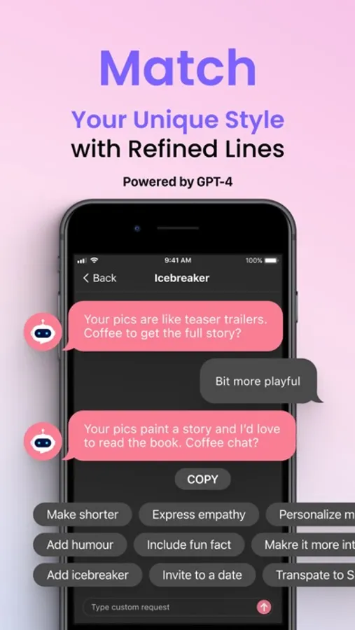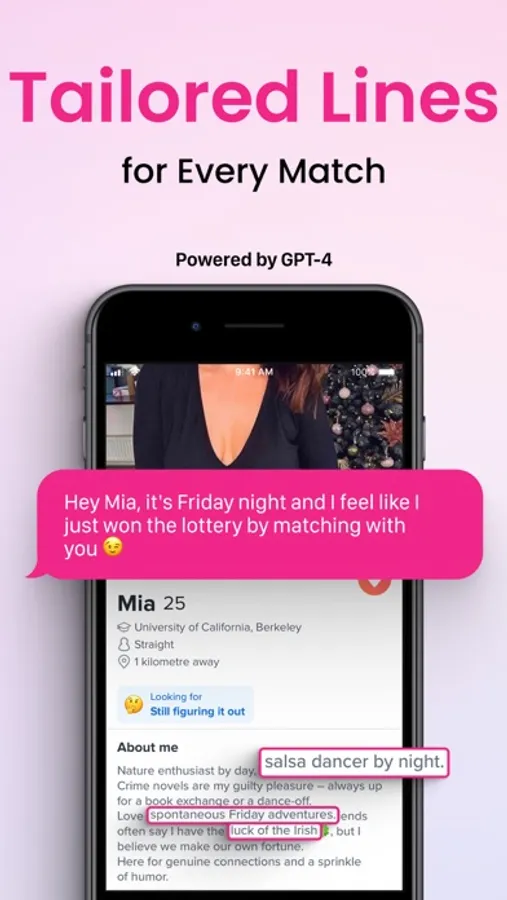 * Unique Opening Lines: Ditch the clichés and impress your matches with personalized messages based on their profiles.