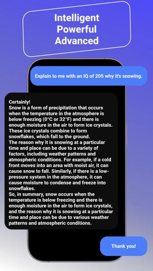 AI Chat 4 Pro communicates with you in natural language, making it easy and convenient to use. It can help you plan for the future or answer any questions you may have. Whether you need to learn about new technologies or get advice on business development - AI Chat 4 Pro has got you covered.