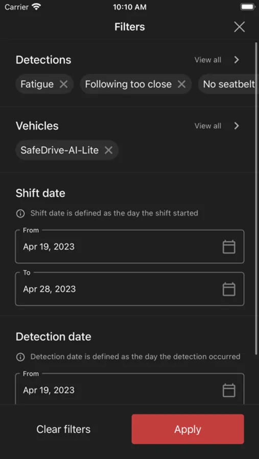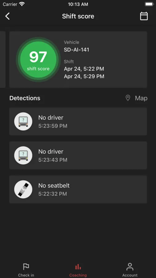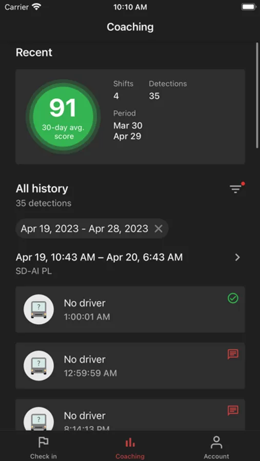Use the SN5 Drivers app to review your score history, view details of any detection events, and to discuss or contest individual detections as needed.
