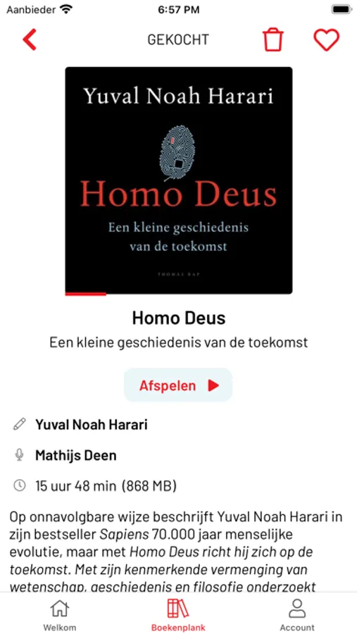 Alle digitale luisterboeken die u koopt bij Libris kunt u met de app downloaden en afspelen. Om opslagruimte te besparen kunt u luisterboeken ook weer verwijderen (en later opnieuw downloaden). De aankopen verschijnen automatisch bij de tab 'Boekenplank'.