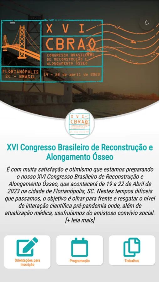 É com muita satisfação e otimismo que estamos preparando o nosso XVI Congresso Brasileiro de Reconstrução e Alongamento Ósseo, que acontecerá de 19 a 22 de Abril de 2023 na cidade de Florianópolis, SC. Nestes tempos difíceis que passamos, o objetivo é olhar para frente e resgatar o nível de interação científica pré-pandemia onde, além de atualização médica, usufruíamos do amistoso convívio social.