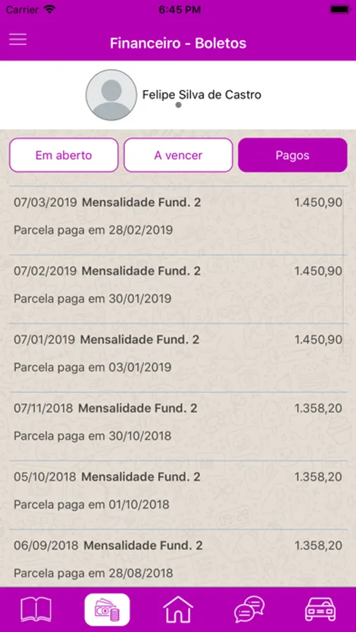 - Impressão de boleto bancário (para responsáveis financeiros) com atualização de valores;