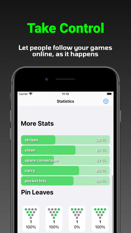 Our app puts tons of useful stats right at your fingertips. Ever wondered what your average would be if you picked up all your single pin spares? Ever wondered what spares you leave the most, and how often you are able to pick it up? Well, with Bowling Mate, you can find out!