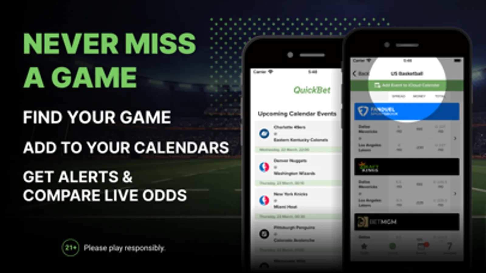 Never miss another game with the QuickBet calendar feature. Find your game and add it directly to your calendar from the app and set yourself a reminder.