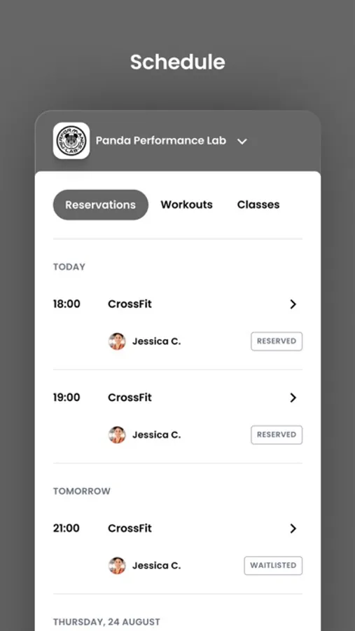 For members of Panda Performance Lab to reserve their place in a class, sign up for gym events, and general account management like updating headshots and credit card on file.