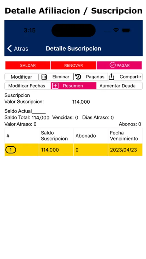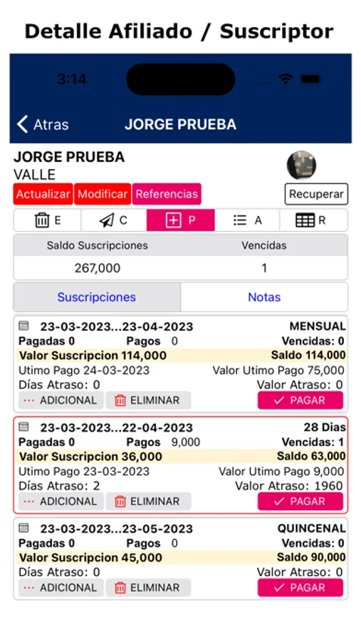 --- Obviamente tendrás que registrar pagos, entras al cliente luego aprietas donde dice PAGAR y le registran el valor de la suscripción, vas a poder registrar un valor ya sea menor , igual o mayor a la cuota el sistema va y aplica el pago.