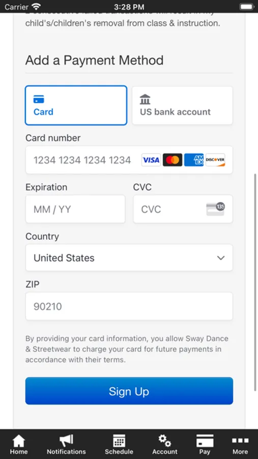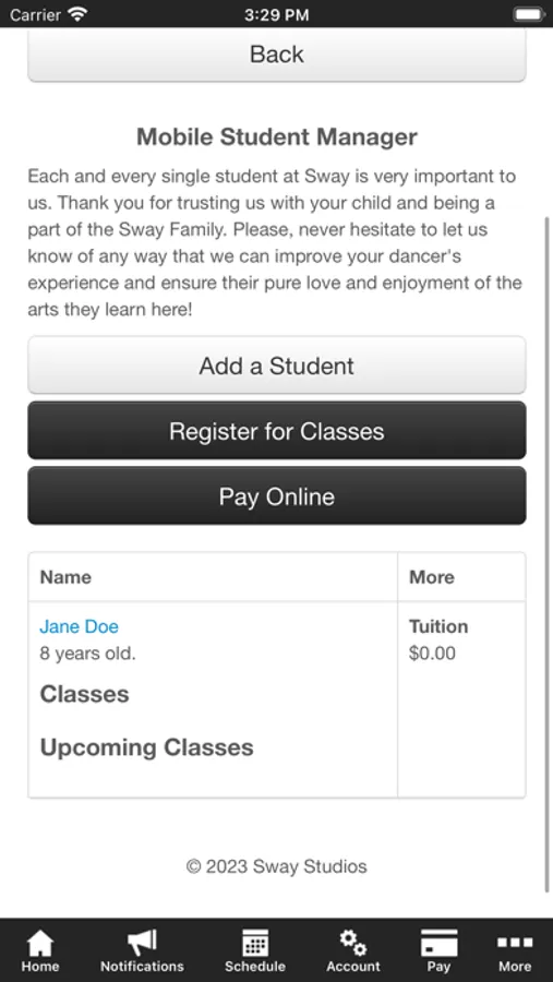 The SWAY app allows you to manage your account with ease, make payments, register for classes, parties, and special events. You'll also receive important notifications about class changes, closings, registration openings, special announcements, and upcoming events.