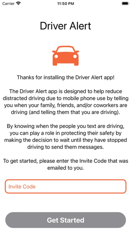 You will need the Invite Code from your email to start using this app since accounts are currently created on our web portal. The web portal is also used to setup a group of people that share driving status with each other.