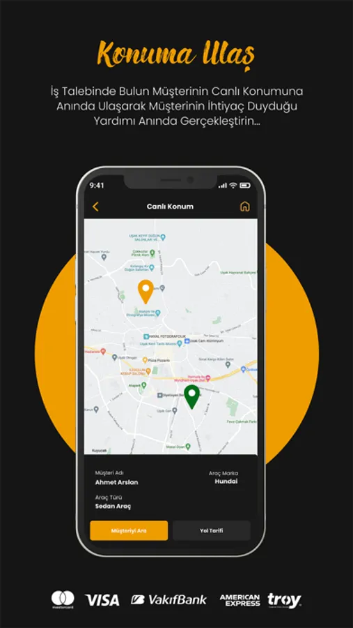 "YOL HİZMETİ" mobil uygulamasını telefonunuza indirin ve uygulamaya kayıt olun. Ardından ihtiyaç duyduğunuz her an Türkiye'nin dilediğiniz yerinde uygulama üzerinde almak istediğiniz yol yardım hizmetini seçin, konumunuzu belirleyin ve en yakın yol yardım ekibimiz en kısa sürede size ulaşsın.