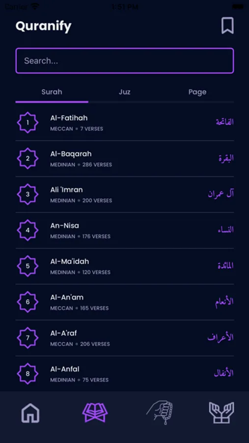 Firstly, the app offers a Quran search feature that allows users to search for specific surahs, juz, and pages in the Quran, which simplifies the navigation process and makes it easier for users to find particular verses they are interested in.