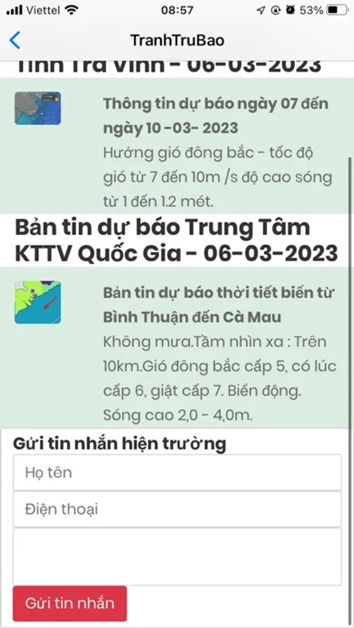 - Thông tin tin tức về dự báo thời tiết, bão, gửi tin nhắn hiện trường bão.