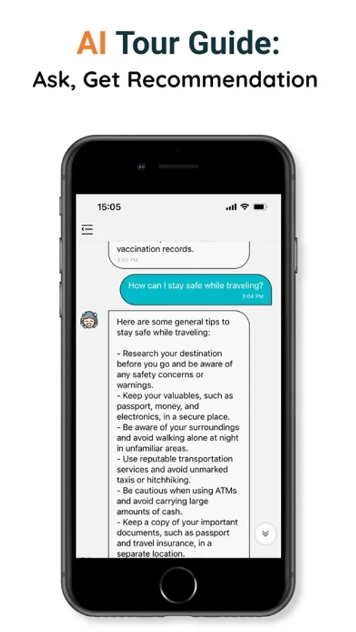 - Chat with an AI travel companion: Your intelligent AI travel companion is always ready to assist you with travel tips, recommendations, and information about your destination.