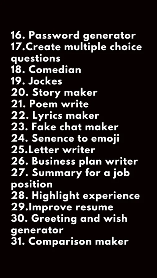 Whether you need help solving a quiz, finding synonyms, solving puzzles, answering interview questions, or getting tips and tricks, Easy ChatBoat has got you covered. You can even use Easy ChatBoat to generate passwords, create multiple-choice questions, tell jokes, write stories, poems, and lyrics, create fake chats, convert sentences to emojis, write letters, and create business plans.