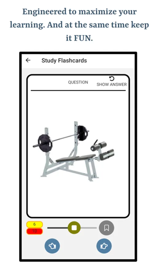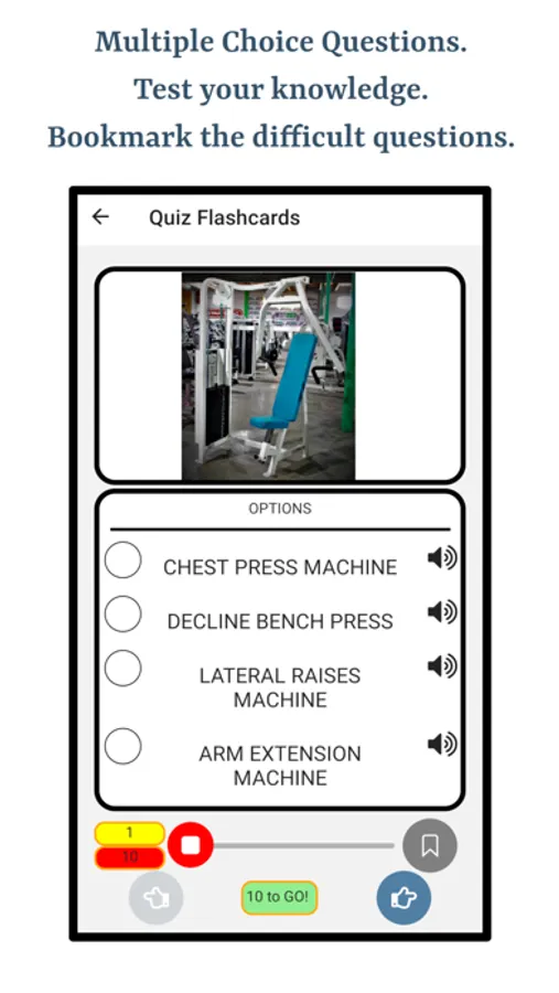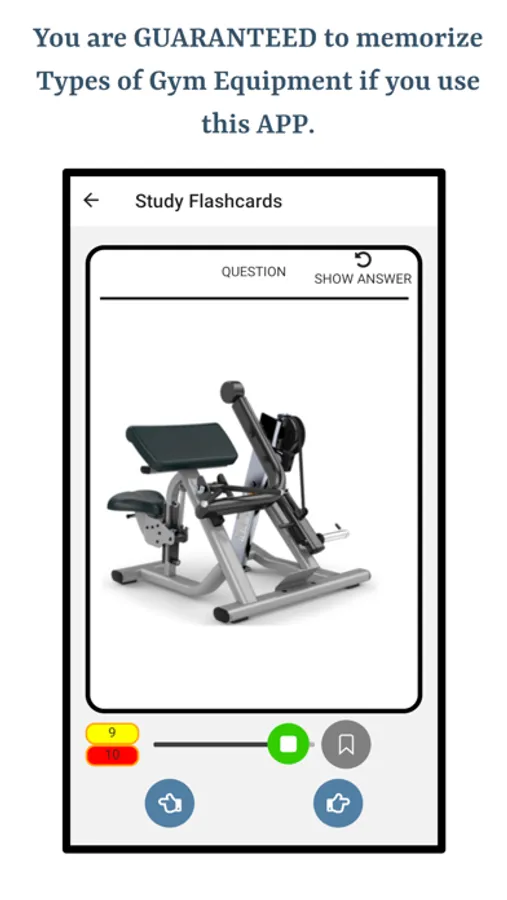This app is a great resource to memorize Gym Equipment. The app is engineered to make users perfect identifying famous Gym Equipment by studying for a very short amount of time. Audio functionality and bookmarking is available throughout the app on chapter, section, study mode and quiz modes.