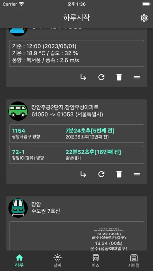 - 날씨, 버스도착, 지하철 출발시간 확인