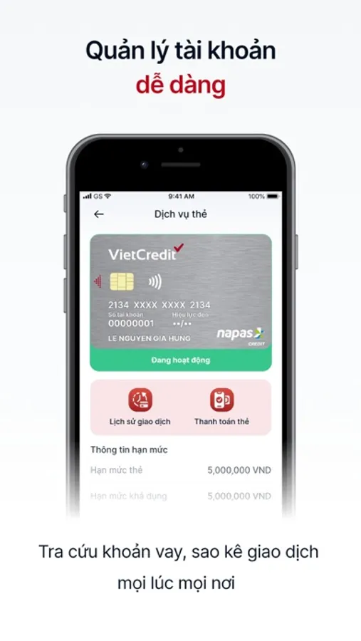 • Quản lý tài khoản Thẻ tín dụng nội địa VietCredit tiện lợi: tra cứu khoản vay, sao kê giao dịch mọi lúc mọi nơi.
